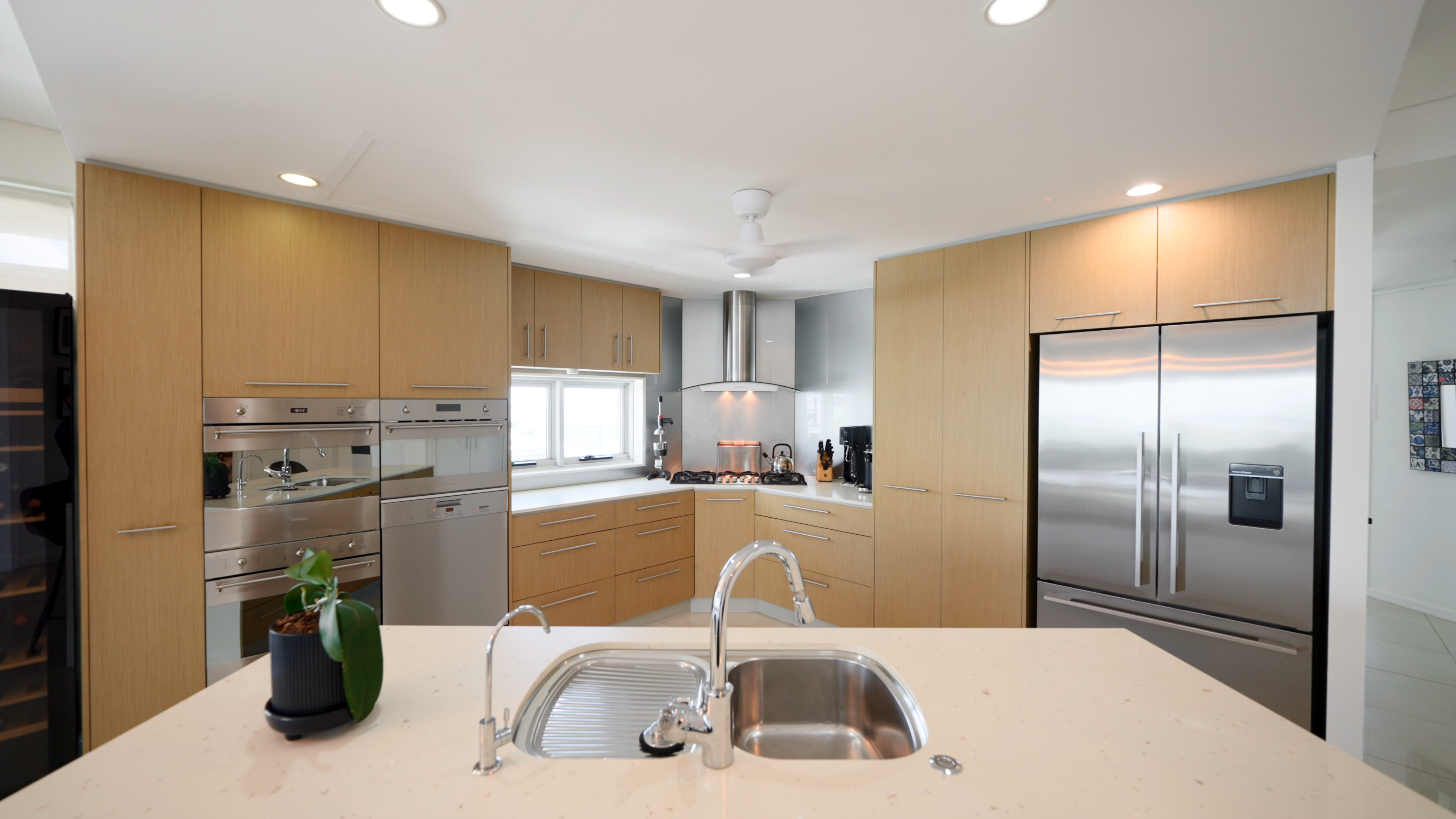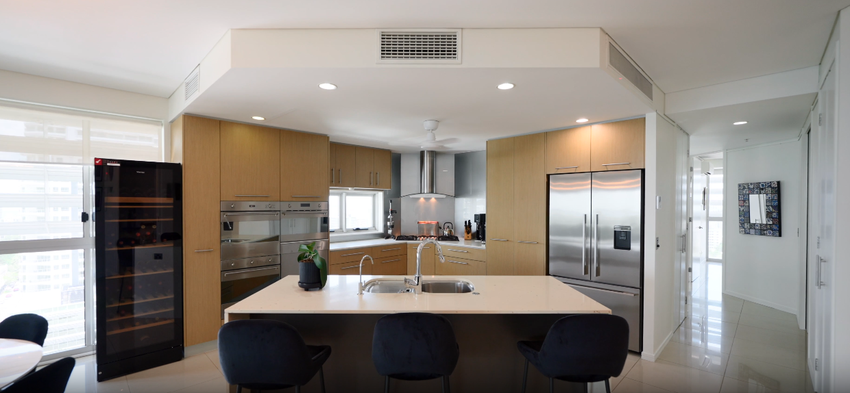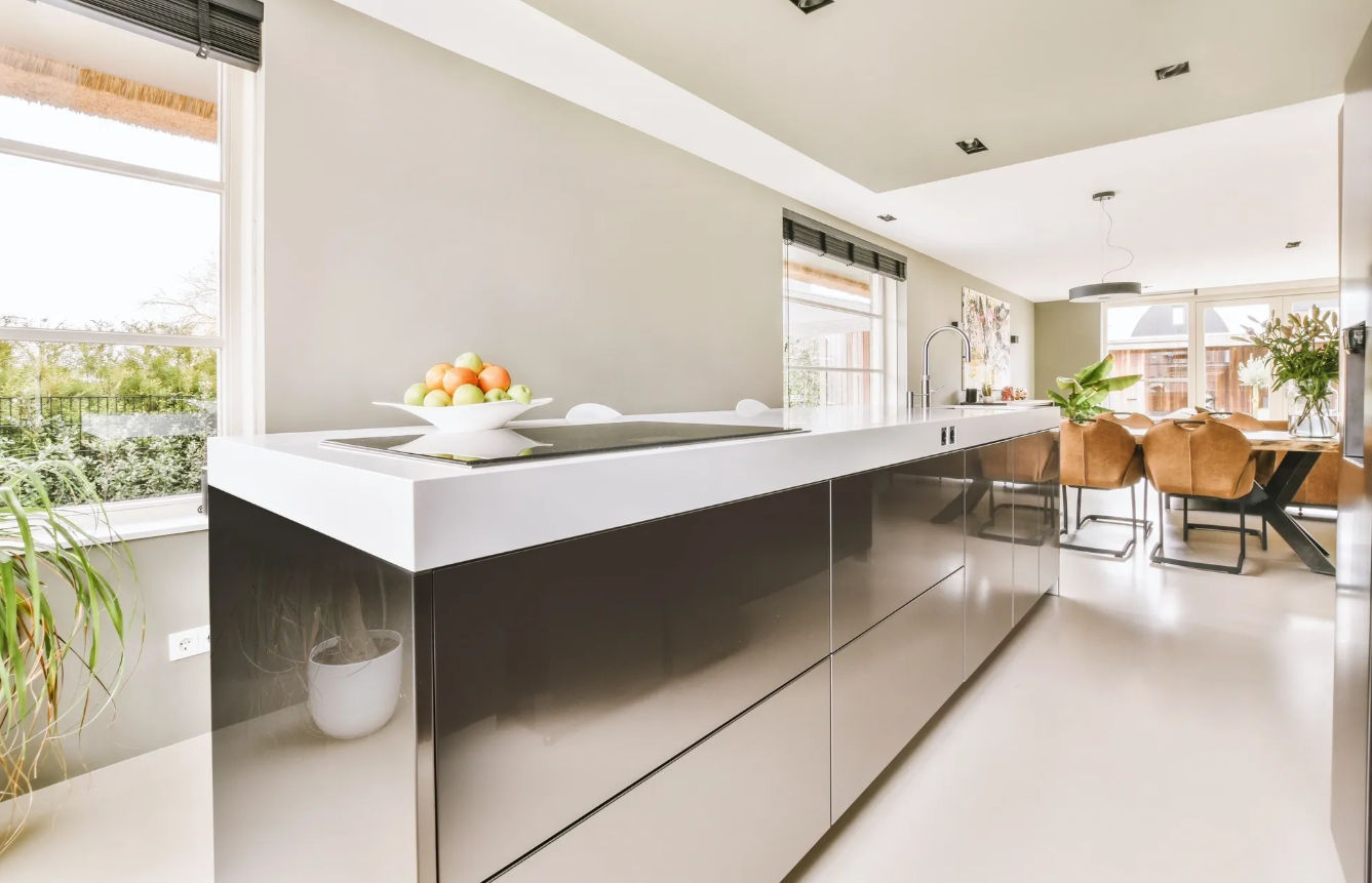 Clean lines, concealed handles, and seamless surfaces create a sleek, contemporary aesthetic, while durable, easy-to-maintain materials support daily heavy use. Smart storage solutions—such as vertical cabinets, soft-close drawers, and modular shelving—optimise space without visual clutter.