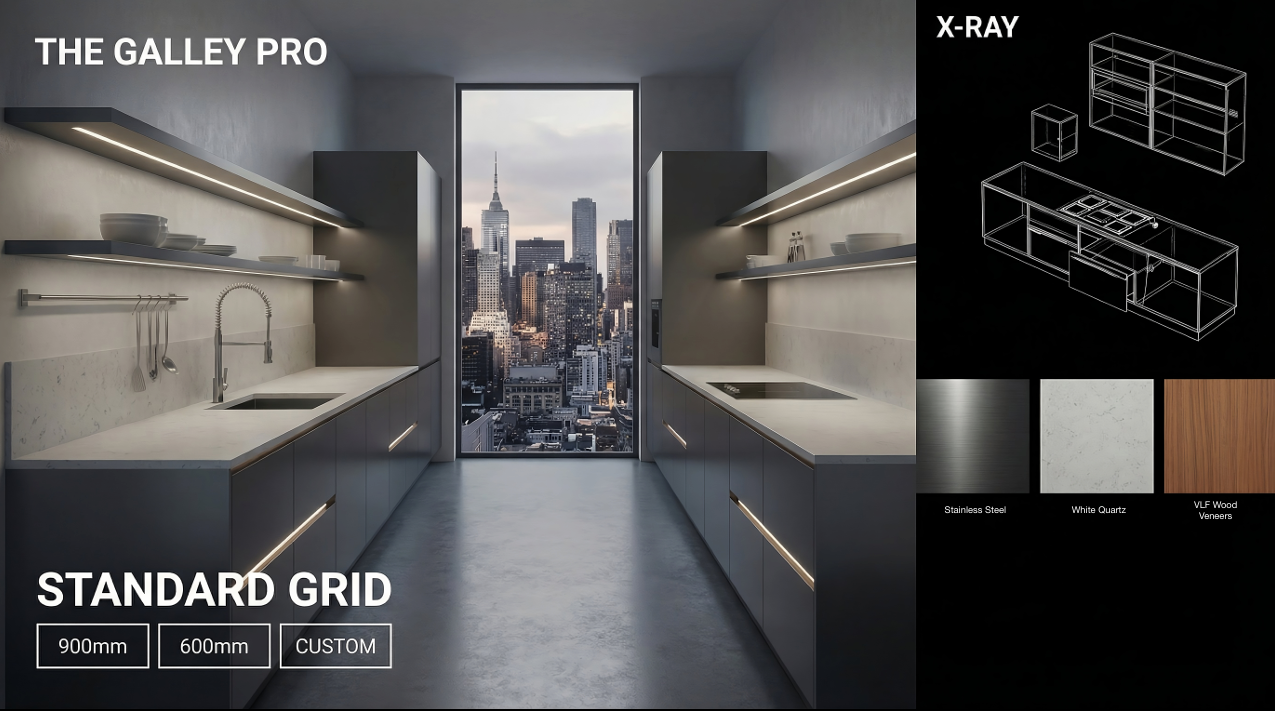 The Galley-Bro Kitchen is a compact, high-efficiency kitchen layout designed around modular systems to maximise workflow, storage, and flexibility within narrow or limited spaces. Inspired by professional galley kitchens, the design features parallel work zones that support smooth movement from preparation to cooking and plating.