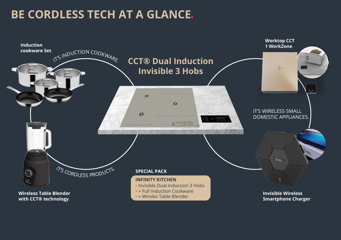 The Cloen CCT Ecosystem is an all-in-one system that makes life in the kitchen easier and saves energy. It operates through a series of key components: Wireless Energy Transmission Technology: At the heart of the system is Cloen Cordless Technology (CCT), which allows appliances to function without the need for batteries or cables. This is achieved through wireless energy transmission from the dual induction plates to the appliances, ensuring a continuous and uninterrupted power source.